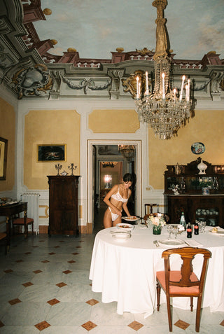 The fusion of architecture and fashion creates a visual narrative where history and modern sensuality coalesce. As you move through the ornate rooms, the interplay between old-world luxury and the contemporary designs of the Be Mine and Dainty collections evokes a sense of whimsical romance. The soft curves of lace mirror the sweeping arches and stately columns of the villa, while the lush fabrics and tailored cuts reflect a timeless elegance. This collection brings the best of both worlds—a celebration of history's grandeur paired with the sophistication of modern fashion.